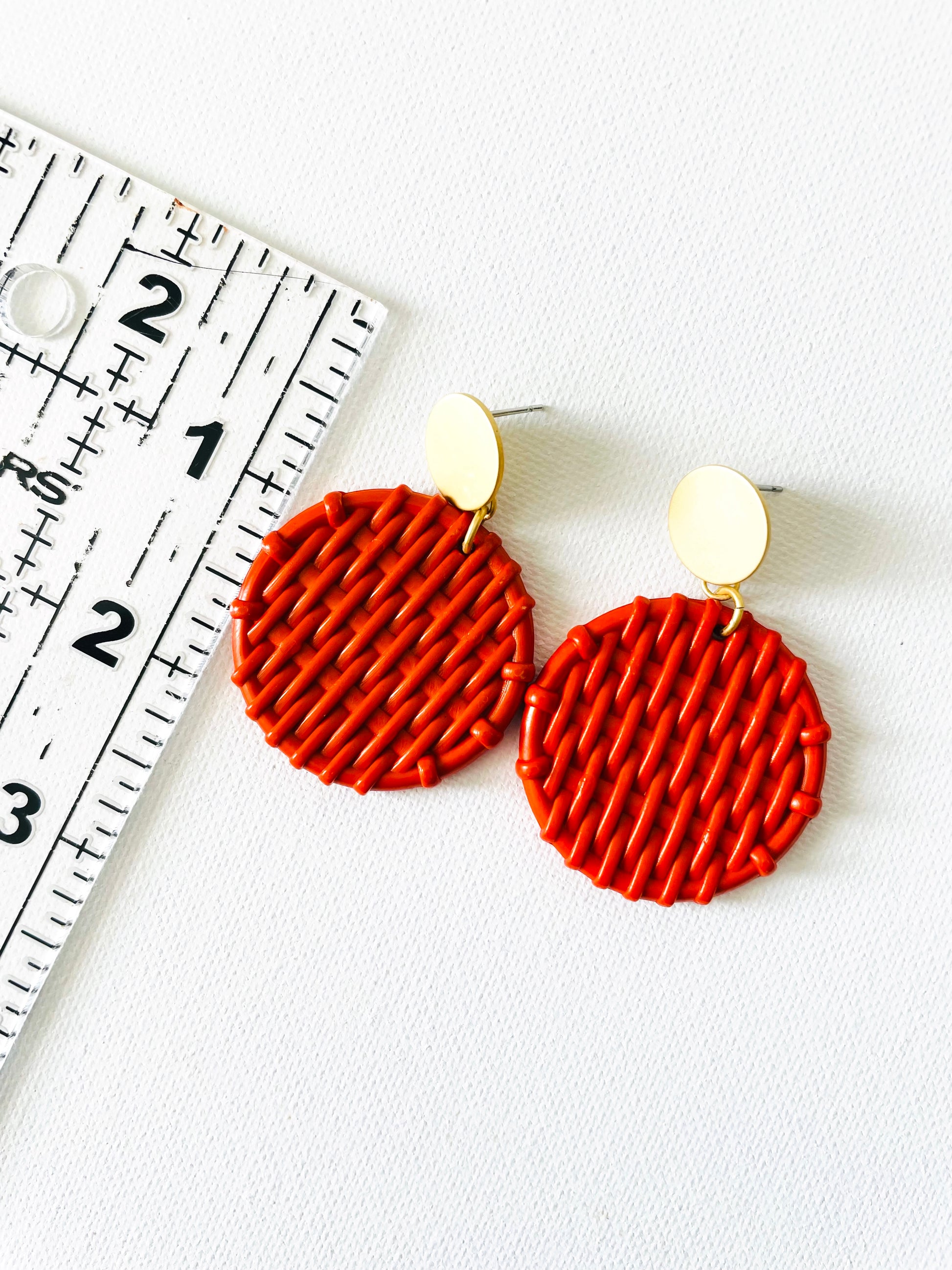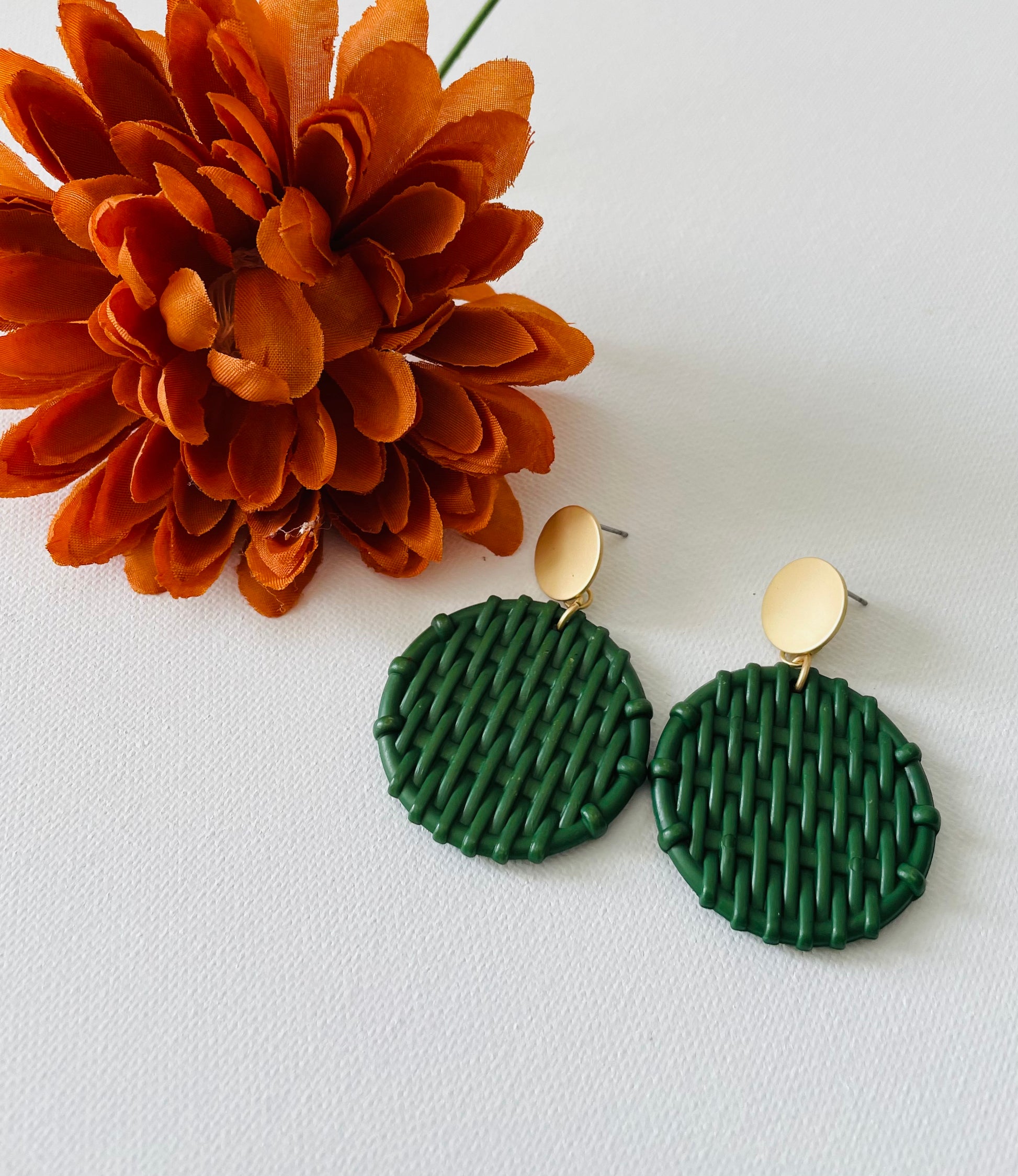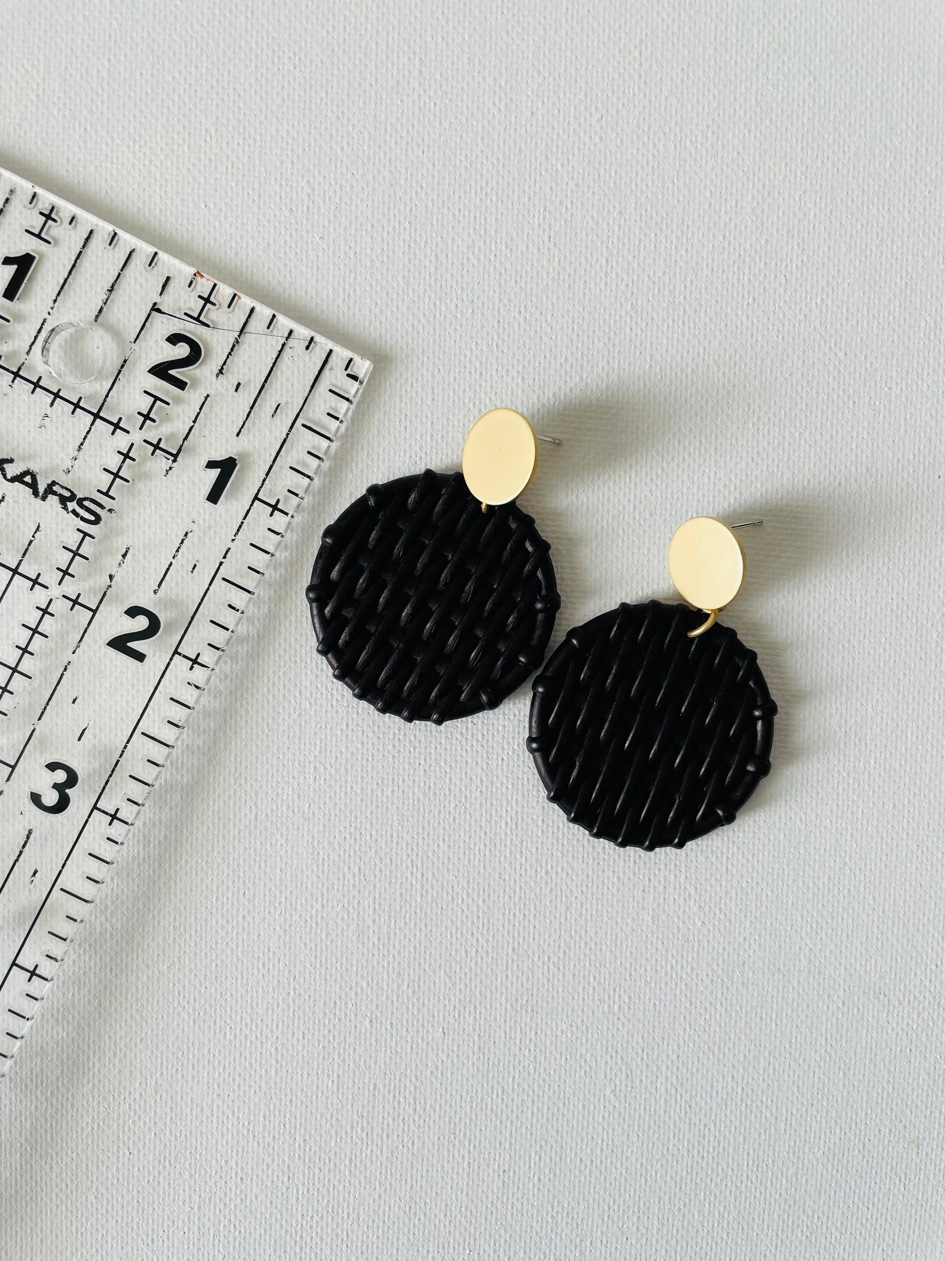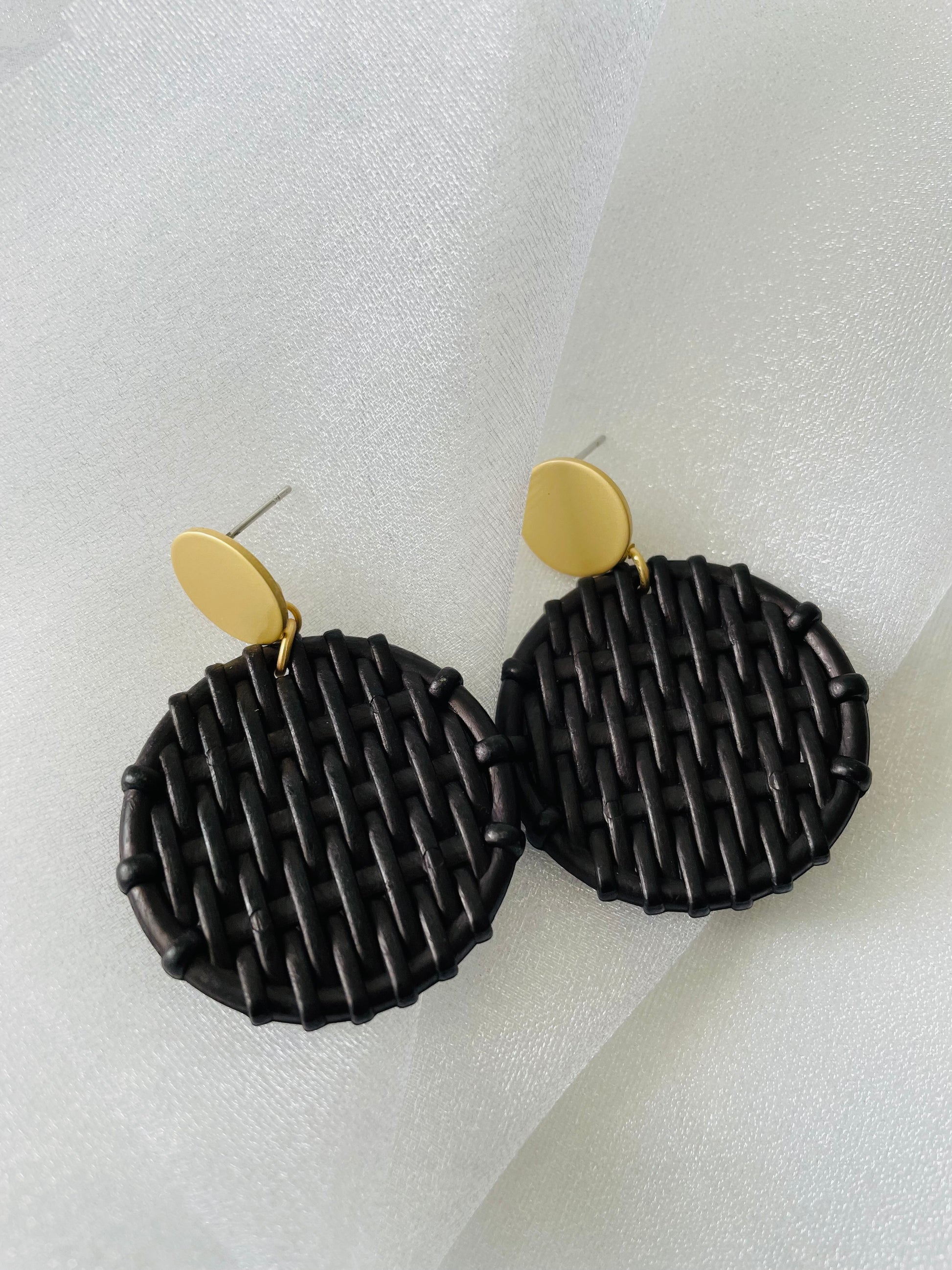 The raffia pattern adds a dash of exotic flair, making these earrings a statement piece that draws attention and sparks conversations. The lightweight design ensures you can wear them all day without discomfort. They’re secured with hypoallergenic hooks for sensitive ears.