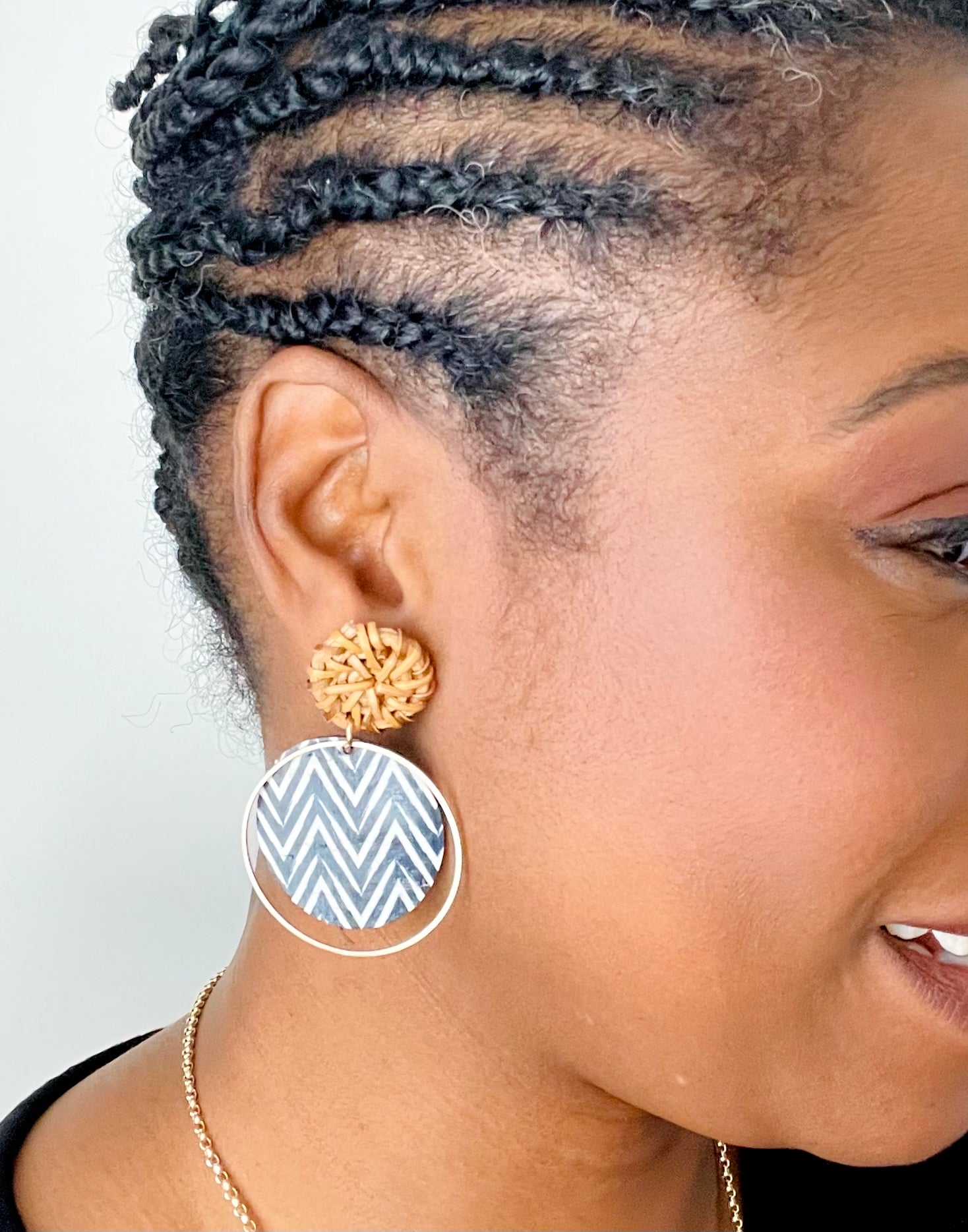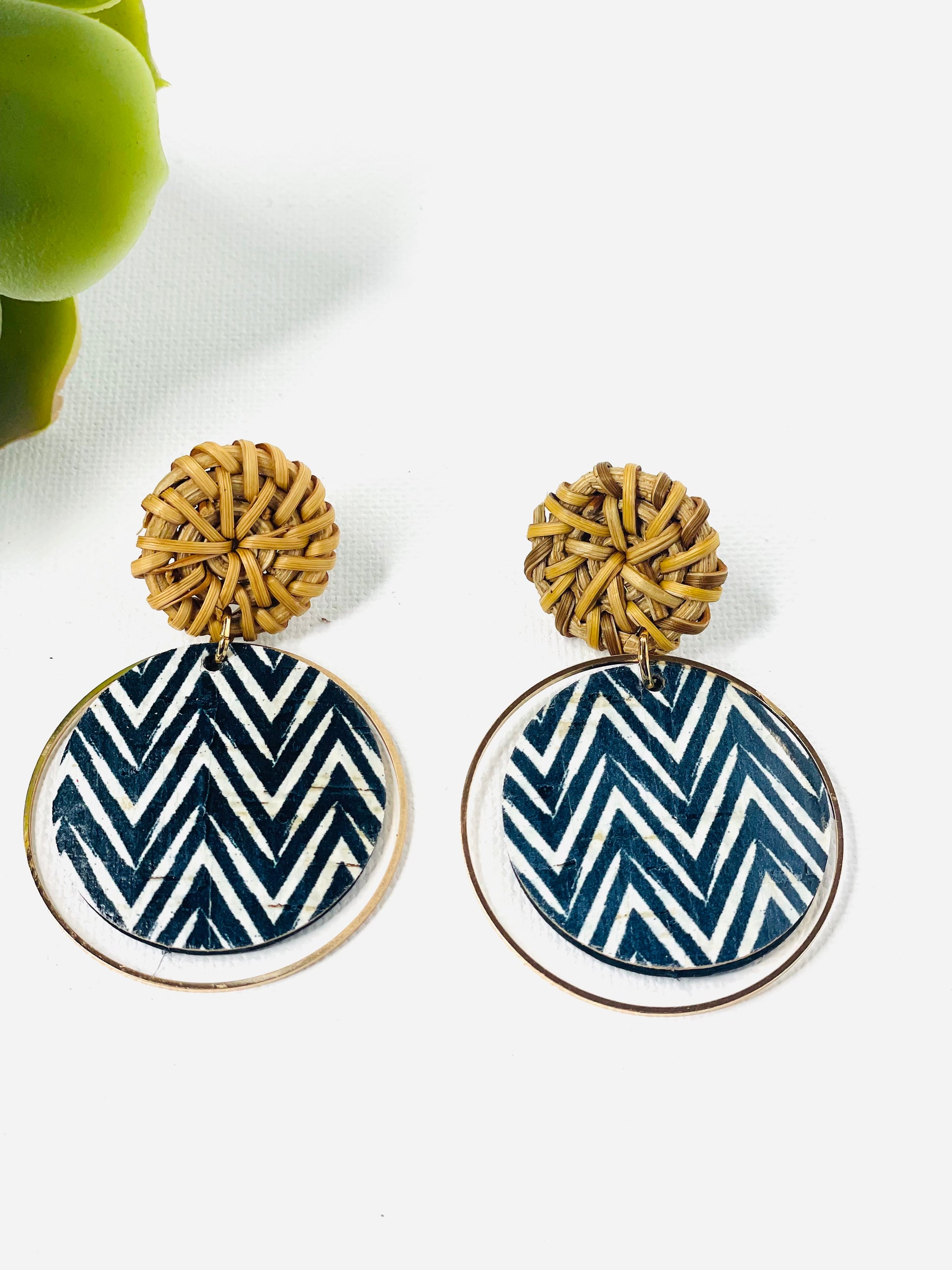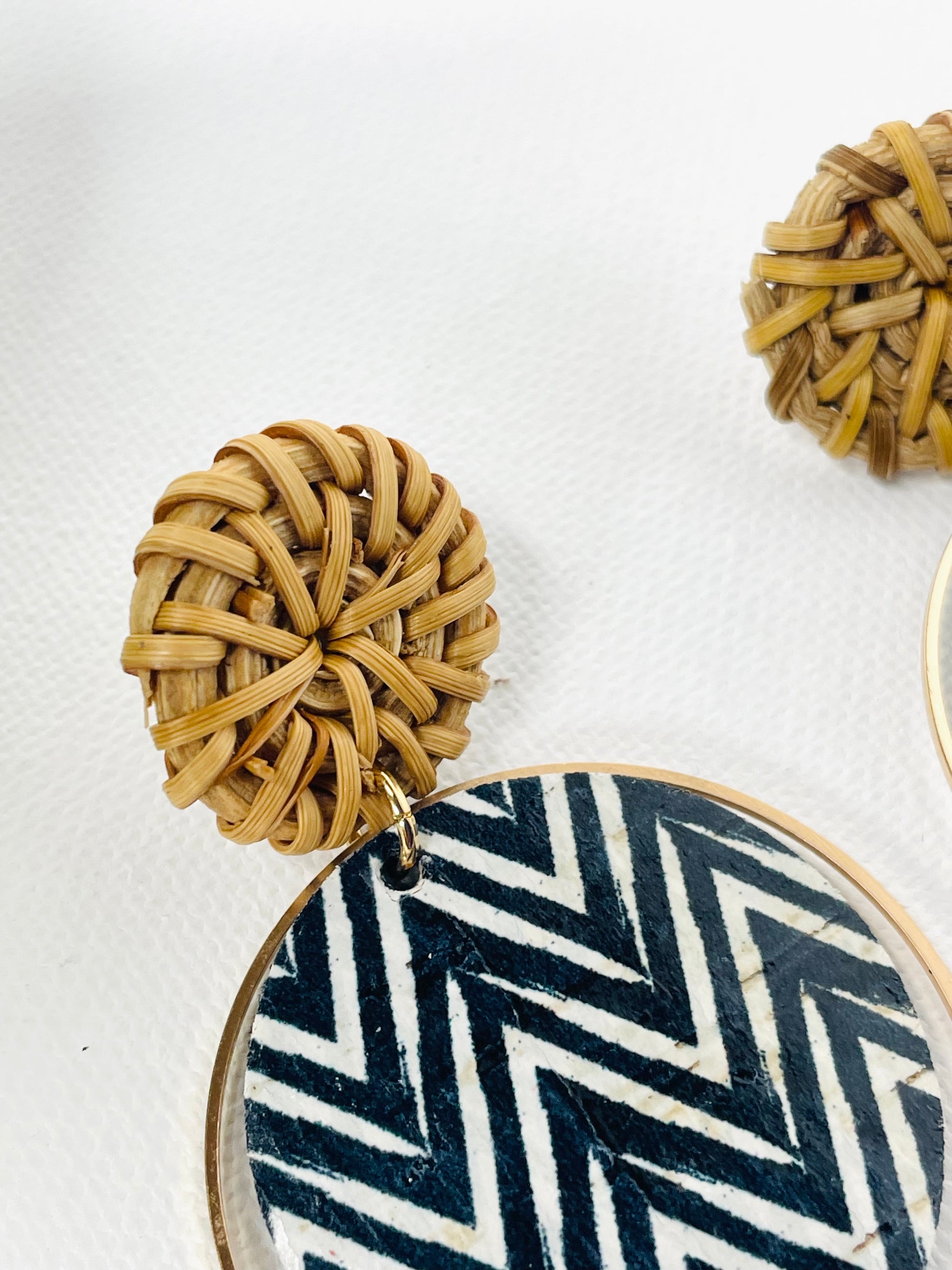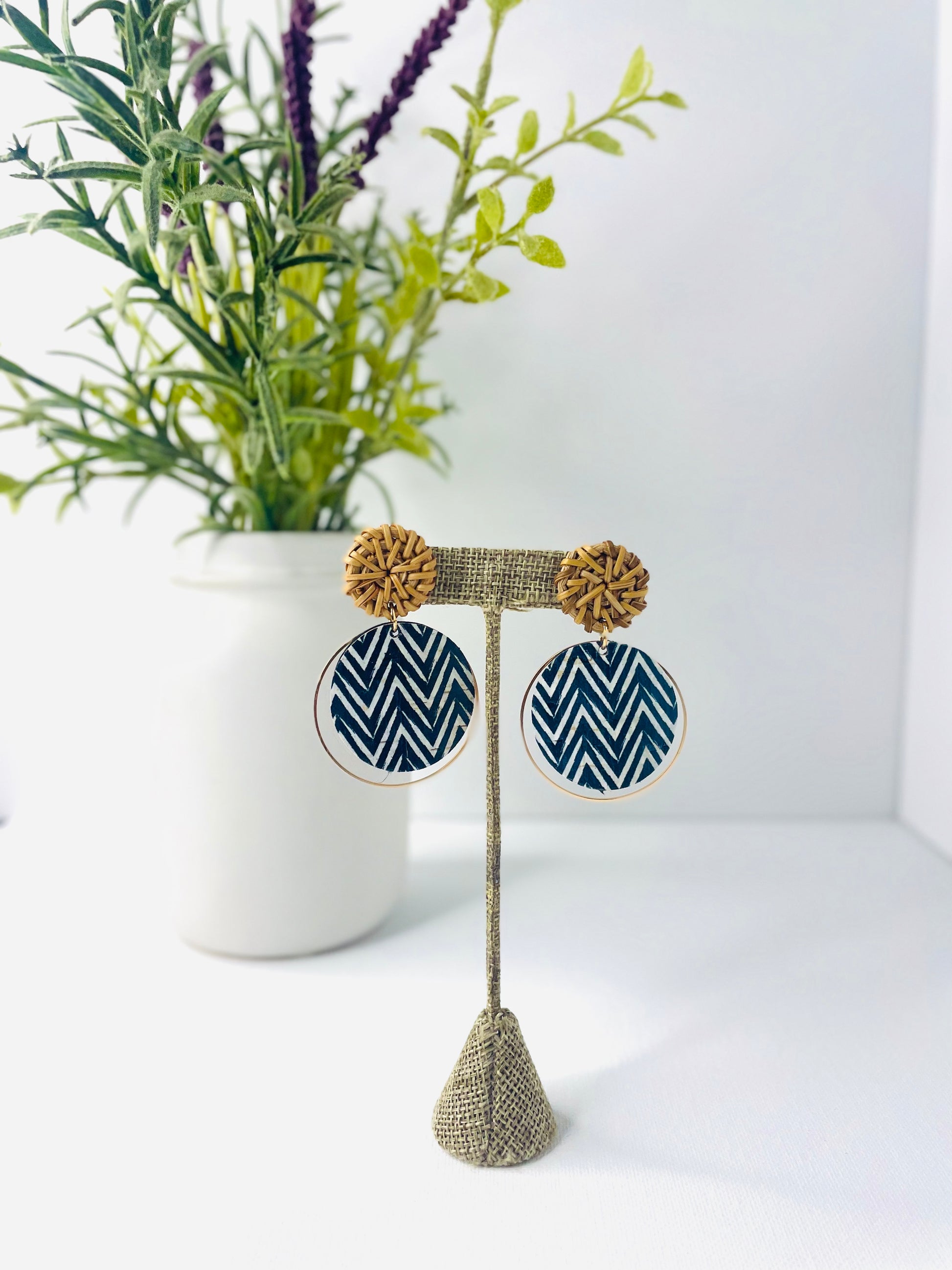 Translated from Italian, "Bella Notte" captures the essence of a beautiful night, and this earring design lives up to its name with undeniable charm. The delicate combination of a raffia stud and an encased chevron circle within a timeless hoop renders this piece both elegant and versatile, suitable for a myriad of occasions. Elevate your style effortlessly by pairing it with a crisp white shirt and your favorite denim pants, or enhance a monochromatic navy blue outfit with this exquisite accessory.