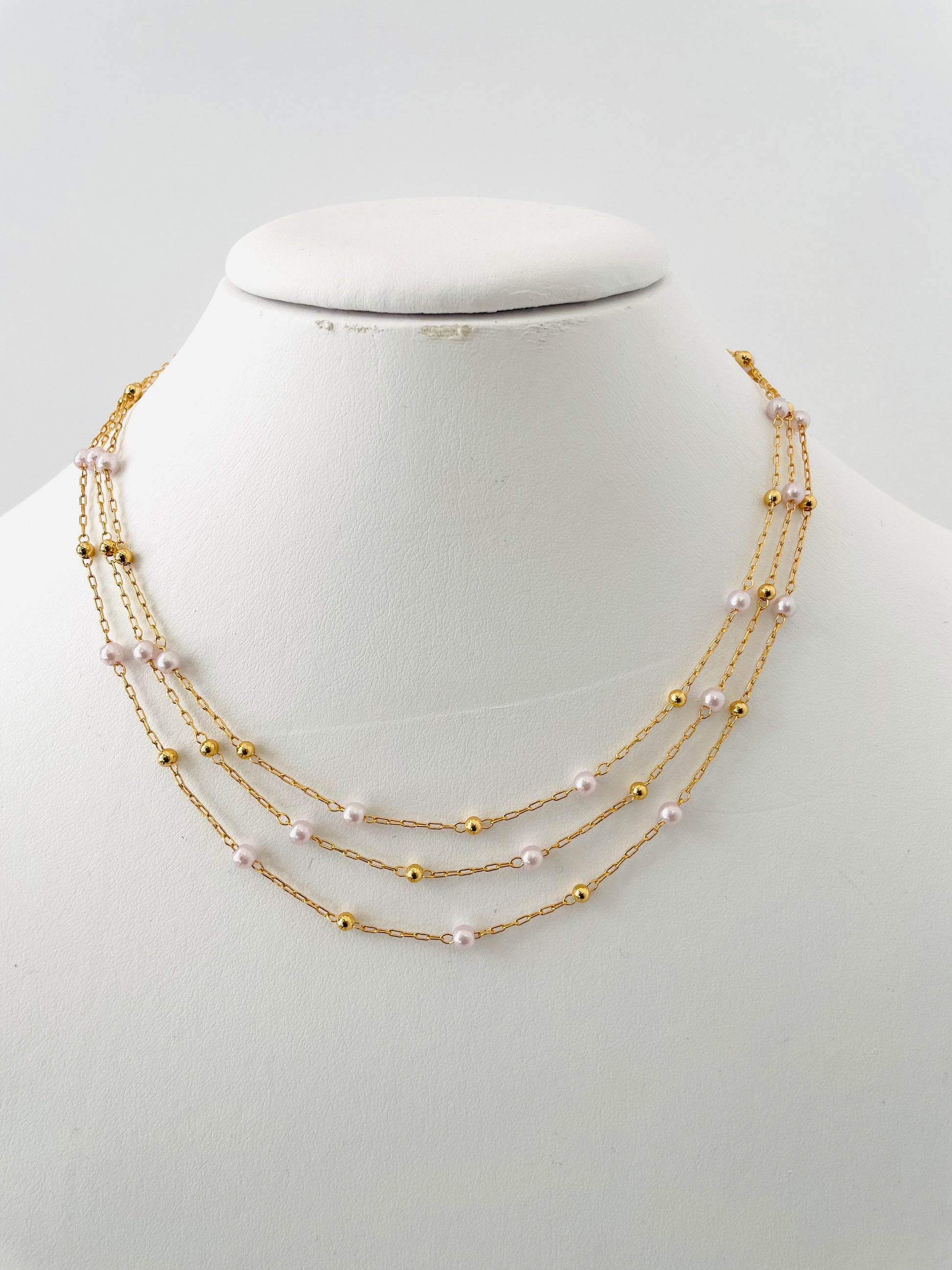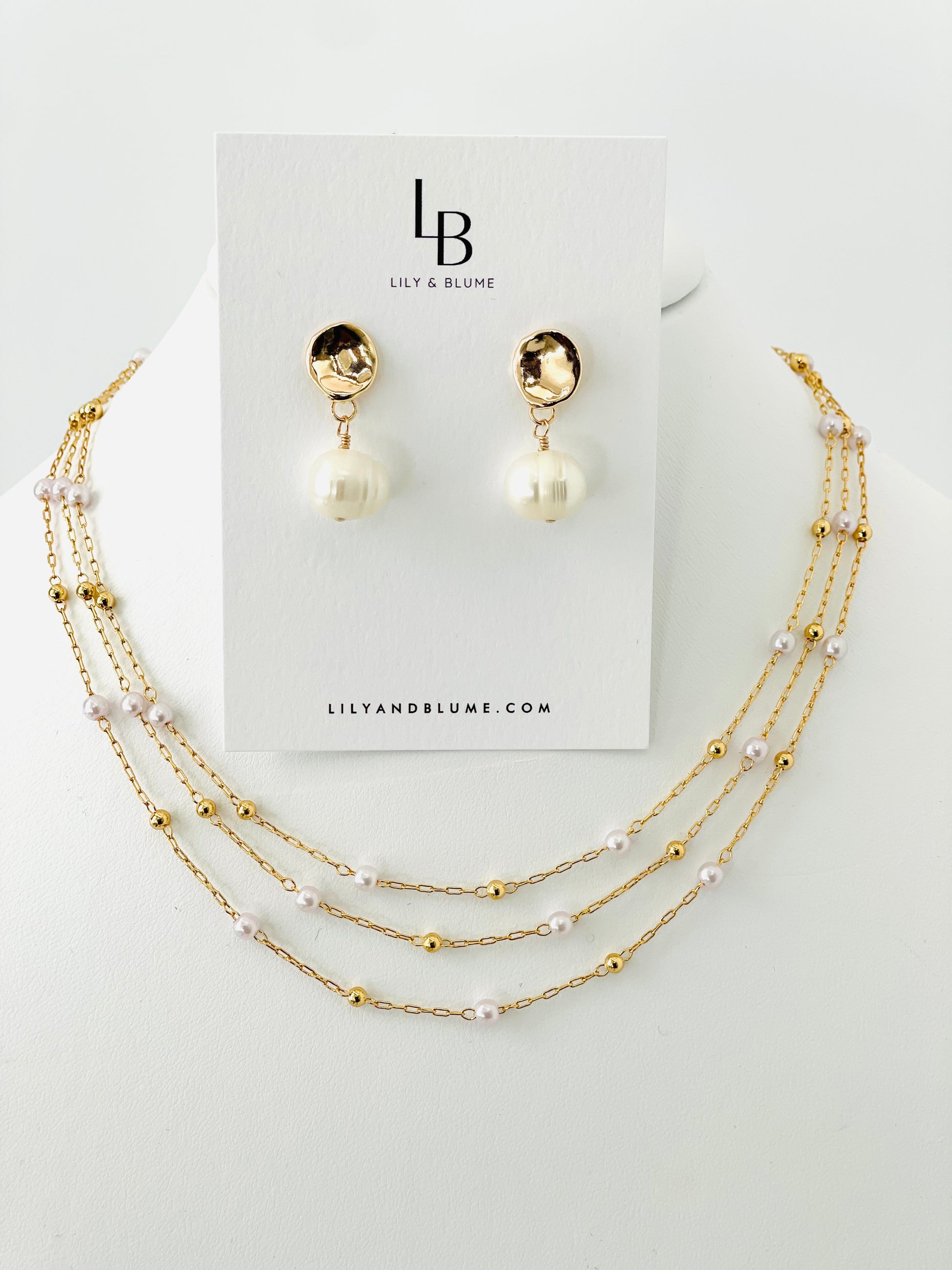 Delicate and refined, the Camille necklace features three graceful tiers for an effortlessly elegant look. Designed for versatility, its subtle layering adds depth without overpowering, making it perfect for everyday wear or special occasions. Pairs beautifully with the Cecilia earrings for a complete, polished ensemble.